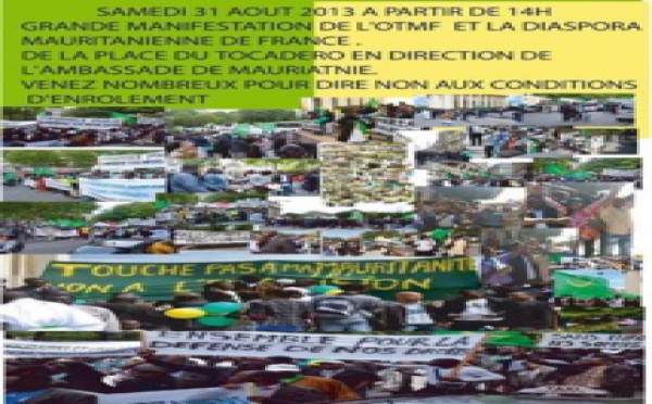 Nous Organisations des Travailleurs Mauritaniens en France (OTMF) et la Diaspora Mauritanienne de France vous appellent pour un Sit-in et une marche populaire qu'elles organisent pour protester pacifiquement contre l’enrôlement discriminatoire des autorités mauritaniennes en France. Rendez-vous à la Place Trocadéro pour la...